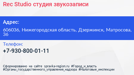 Rec Studio, студия звукозаписи по адресу 606036, Нижегородская область, Дзержинск, Матросова, 36 в дальнейшем Организация, размещена в следующих категориях: