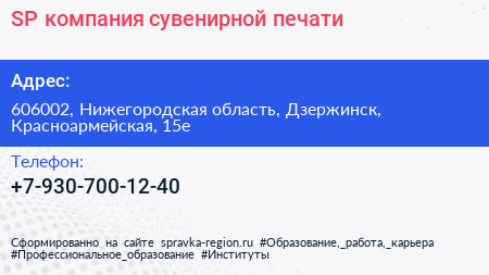 SP, компания сувенирной печати по адресу 606002, Нижегородская область, Дзержинск, Красноармейская, 15е в дальнейшем Организация, размещена в следующих категориях: