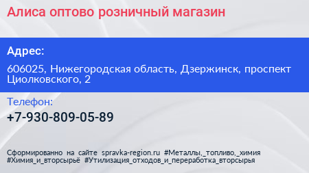 Алиса, оптово-розничный магазин по адресу 606025, Нижегородская область, Дзержинск, проспект Циолковского, 2 в дальнейшем Организация, размещена в следующих категориях: