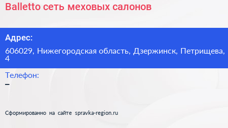 Balletto, сеть меховых салонов по адресу 606029, Нижегородская область, Дзержинск, Петрищева, 4 в дальнейшем Организация, размещена в следующих категориях: