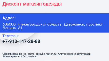 Дисконт, магазин одежды по адресу 606000, Нижегородская область, Дзержинск, проспект Ленина, 61 в дальнейшем Организация, размещена в следующих категориях: