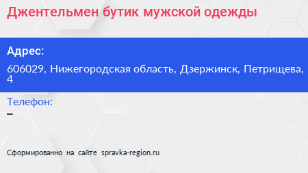 Джентельмен, бутик мужской одежды по адресу 606029, Нижегородская область, Дзержинск, Петрищева, 4 в дальнейшем Организация, размещена в следующих категориях:
