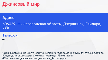 Джинсовый мир по адресу 606029, Нижегородская область, Дзержинск, Гайдара, 59Б в дальнейшем Организация, размещена в следующих категориях: