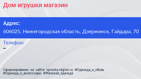 Дом игрушки, магазин по адресу 606025, Нижегородская область, Дзержинск, Гайдара, 70 в дальнейшем Организация, размещена в следующих категориях: