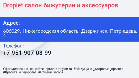 Droplet, салон бижутерии и аксессуаров по адресу 606029, Нижегородская область, Дзержинск, Петрищева, 4 в дальнейшем Организация, размещена в следующих категориях: