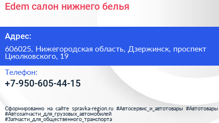 Edem, салон нижнего белья по адресу 606025, Нижегородская область, Дзержинск, проспект Циолковского, 19 в дальнейшем Организация, размещена в следующих категориях: