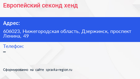 Европейский, секонд-хенд по адресу 606023, Нижегородская область, Дзержинск, проспект Ленина, 49 в дальнейшем Организация, размещена в следующих категориях: