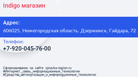 Indigo, магазин по адресу 606025, Нижегородская область, Дзержинск, Гайдара, 72 в дальнейшем Организация, размещена в следующих категориях: