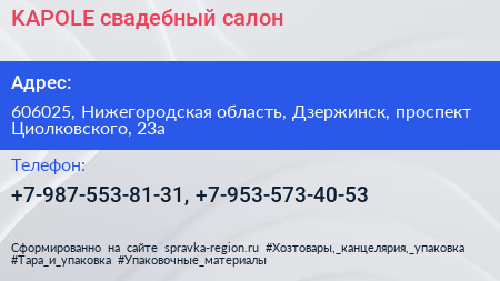 KAPOLE, свадебный салон по адресу 606025, Нижегородская область, Дзержинск, проспект Циолковского, 23а в дальнейшем Организация, размещена в следующих категориях: