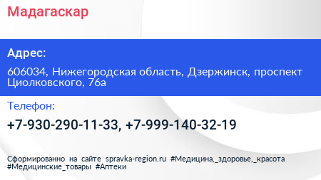 Мадагаскар по адресу 606034, Нижегородская область, Дзержинск, проспект Циолковского, 76а в дальнейшем Организация, размещена в следующих категориях: