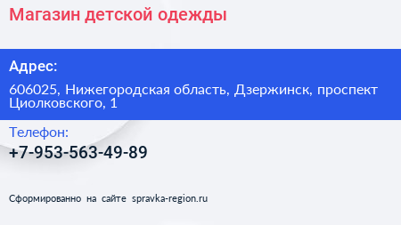 Магазин детской одежды по адресу 606025, Нижегородская область, Дзержинск, проспект Циолковского, 1 в дальнейшем Организация, размещена в следующих категориях: