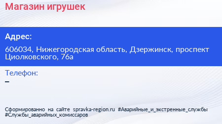 Магазин игрушек по адресу 606034, Нижегородская область, Дзержинск, проспект Циолковского, 76а в дальнейшем Организация, размещена в следующих категориях: