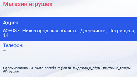 Магазин игрушек по адресу 606037, Нижегородская область, Дзержинск, Петрищева, 14 в дальнейшем Организация, размещена в следующих категориях: