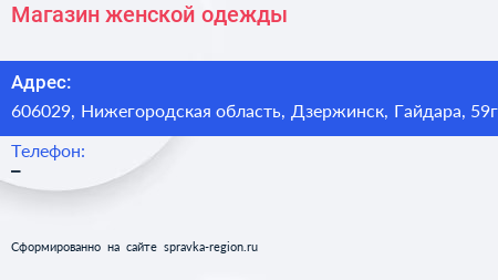 Магазин женской одежды по адресу 606029, Нижегородская область, Дзержинск, Гайдара, 59г в дальнейшем Организация, размещена в следующих категориях: