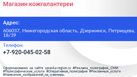 Магазин кожгалантереи по адресу 606037, Нижегородская область, Дзержинск, Петрищева, 18/39 в дальнейшем Организация, размещена в следующих категориях: