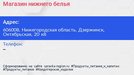 Магазин нижнего белья по адресу 606008, Нижегородская область, Дзержинск, Октябрьская, 20 к8 в дальнейшем Организация, размещена в следующих категориях: