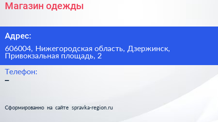 Магазин одежды по адресу 606004, Нижегородская область, Дзержинск, Привокзальная площадь, 2 в дальнейшем Организация, размещена в следующих категориях:
