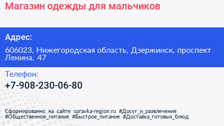 Магазин одежды для мальчиков по адресу 606023, Нижегородская область, Дзержинск, проспект Ленина, 47 в дальнейшем Организация, размещена в следующих категориях: