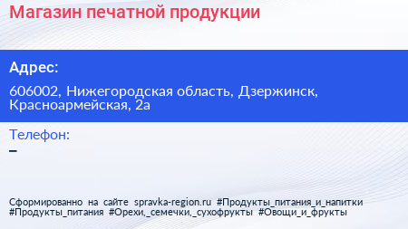 Магазин печатной продукции по адресу 606002, Нижегородская область, Дзержинск, Красноармейская, 2а в дальнейшем Организация, размещена в следующих категориях: