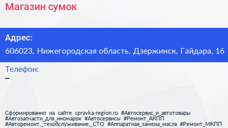 Магазин сумок по адресу 606023, Нижегородская область, Дзержинск, Гайдара, 16 в дальнейшем Организация, размещена в следующих категориях: