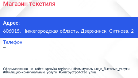Магазин текстиля по адресу 606015, Нижегородская область, Дзержинск, Ситнова, 2 в дальнейшем Организация, размещена в следующих категориях: