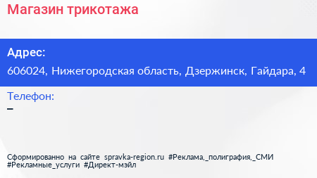 Магазин трикотажа по адресу 606024, Нижегородская область, Дзержинск, Гайдара, 4 в дальнейшем Организация, размещена в следующих категориях: