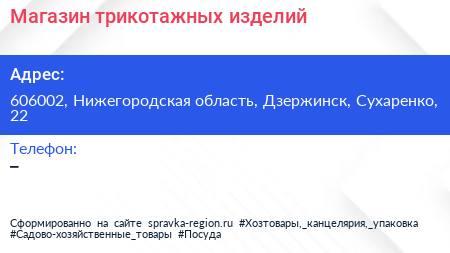 Магазин трикотажных изделий по адресу 606002, Нижегородская область, Дзержинск, Сухаренко, 22 в дальнейшем Организация, размещена в следующих категориях: