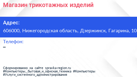 Магазин трикотажных изделий по адресу 606000, Нижегородская область, Дзержинск, Гагарина, 10 в дальнейшем Организация, размещена в следующих категориях: