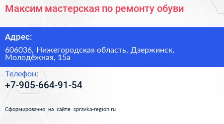 Максим, мастерская по ремонту обуви по адресу 606036, Нижегородская область, Дзержинск, Молодёжная, 15а в дальнейшем Организация, размещена в следующих категориях:
