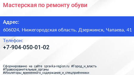 Мастерская по ремонту обуви по адресу 606024, Нижегородская область, Дзержинск, Чапаева, 41 в дальнейшем Организация, размещена в следующих категориях: