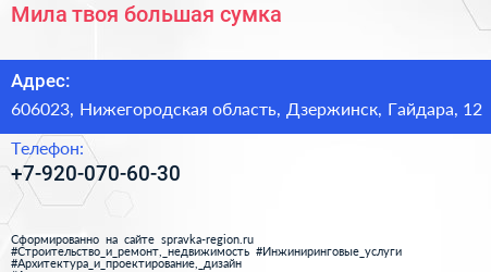 Мила твоя большая сумка по адресу 606023, Нижегородская область, Дзержинск, Гайдара, 12 в дальнейшем Организация, размещена в следующих категориях: