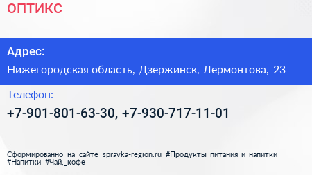 ОПТИКС по адресу Нижегородская область, Дзержинск, Лермонтова, 23 в дальнейшем Организация, размещена в следующих категориях: