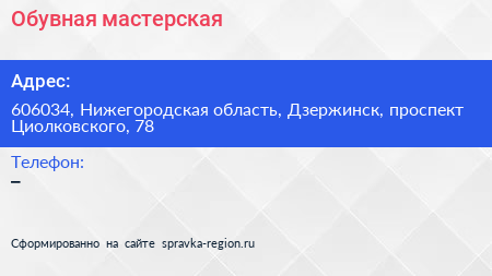 Обувная мастерская по адресу 606034, Нижегородская область, Дзержинск, проспект Циолковского, 78 в дальнейшем Организация, размещена в следующих категориях: