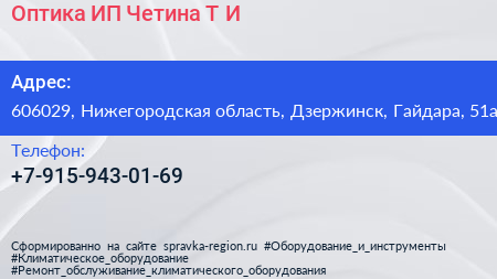 Оптика, ИП Четина Т.И. по адресу 606029, Нижегородская область, Дзержинск, Гайдара, 51а в дальнейшем Организация, размещена в следующих категориях: