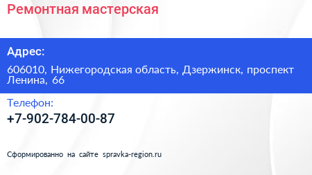 Ремонтная мастерская по адресу 606010, Нижегородская область, Дзержинск, проспект Ленина, 66 в дальнейшем Организация, размещена в следующих категориях: