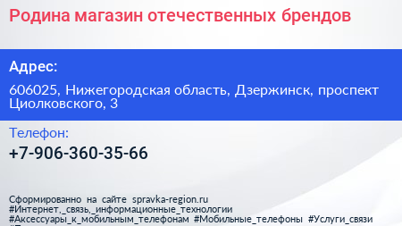 Родина, магазин отечественных брендов по адресу 606025, Нижегородская область, Дзержинск, проспект Циолковского, 3 в дальнейшем Организация, размещена в следующих категориях: