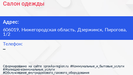 Салон одежды по адресу 606019, Нижегородская область, Дзержинск, Пирогова, 1/2 в дальнейшем Организация, размещена в следующих категориях:
