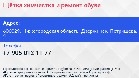 Щётка, химчистка и ремонт обуви по адресу 606029, Нижегородская область, Дзержинск, Петрищева, 4 в дальнейшем Организация, размещена в следующих категориях: