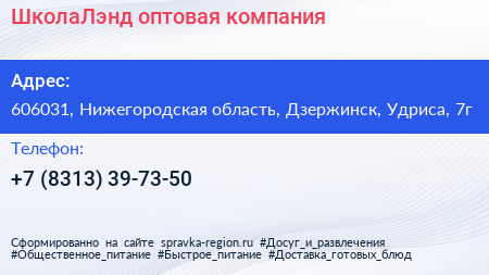 ШколаЛэнд, оптовая компания по адресу 606031, Нижегородская область, Дзержинск, Удриса, 7г в дальнейшем Организация, размещена в следующих категориях: