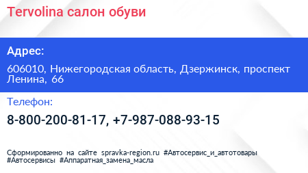 Tervolina, салон обуви по адресу 606010, Нижегородская область, Дзержинск, проспект Ленина, 66 в дальнейшем Организация, размещена в следующих категориях: