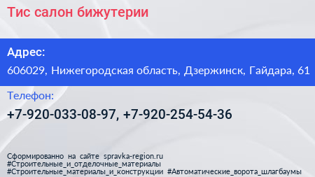 Тис, салон бижутерии по адресу 606029, Нижегородская область, Дзержинск, Гайдара, 61 в дальнейшем Организация, размещена в следующих категориях: