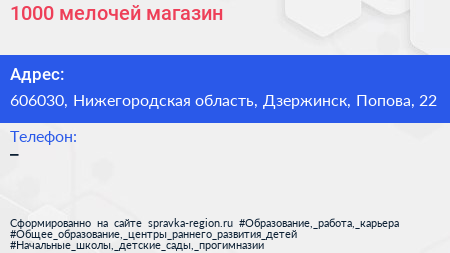 1000 мелочей, магазин по адресу 606030, Нижегородская область, Дзержинск, Попова, 22 в дальнейшем Организация, размещена в следующих категориях: