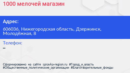 1000 мелочей, магазин по адресу 606036, Нижегородская область, Дзержинск, Молодёжная, 8 в дальнейшем Организация, размещена в следующих категориях: