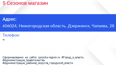 5 Сезонов, магазин по адресу 606024, Нижегородская область, Дзержинск, Чапаева, 28 в дальнейшем Организация, размещена в следующих категориях: