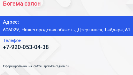Богема, салон по адресу 606029, Нижегородская область, Дзержинск, Гайдара, 61 в дальнейшем Организация, размещена в следующих категориях: