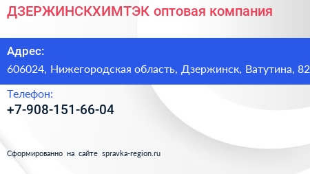 ДЗЕРЖИНСКХИМТЭК, оптовая компания по адресу 606024, Нижегородская область, Дзержинск, Ватутина, 82 в дальнейшем Организация, размещена в следующих категориях: