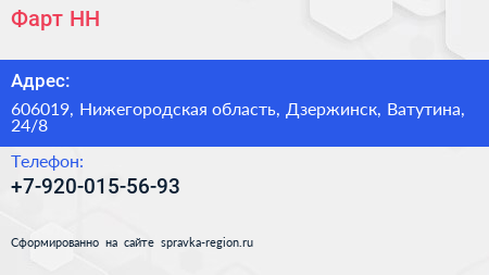 Фарт НН по адресу 606019, Нижегородская область, Дзержинск, Ватутина, 24/8 в дальнейшем Организация, размещена в следующих категориях: