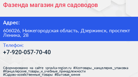 Фазенда, магазин для садоводов по адресу 606026, Нижегородская область, Дзержинск, проспект Ленина, 28 в дальнейшем Организация, размещена в следующих категориях: