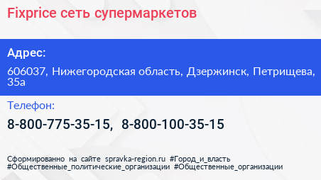 Fixprice, сеть супермаркетов по адресу 606037, Нижегородская область, Дзержинск, Петрищева, 35а в дальнейшем Организация, размещена в следующих категориях: