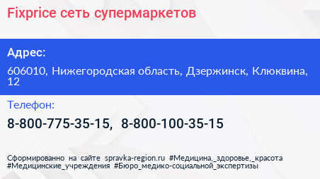 Fixprice, сеть супермаркетов по адресу 606010, Нижегородская область, Дзержинск, Клюквина, 12 в дальнейшем Организация, размещена в следующих категориях: